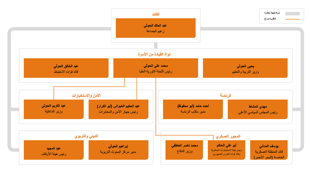 يُظهر المخطط هيكل الأدوار داخل أسرة الحــ،ـوثي وارتباطاتها المؤسسية، إضافةً إلى محاور التنافس مع الأجنحة الأمنية والعسكرية.