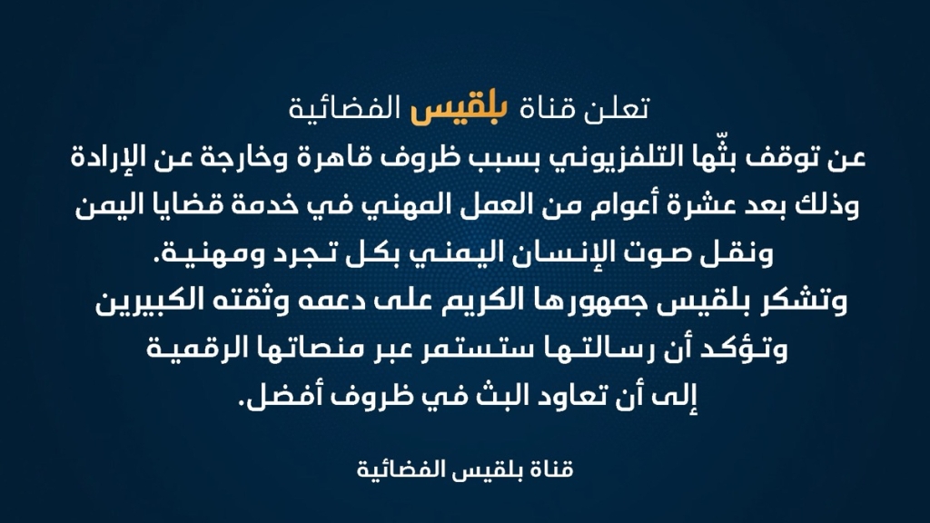 كما قدمت بلقيس الفضائية في نهاية البيان خالص الامتنان لكل العاملين والشركاء والمؤسسات الإعلامية والحقوقية التي دعمت مسيرتها، ولكل من آمن بقيمة الإعلام الحر والمستقل.