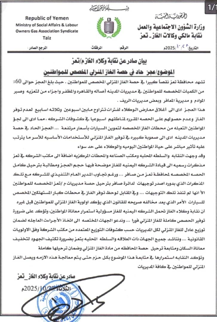 ورغم توجيهات المدير العام التنفيذي للشركة إلى دائرة صافر بسرعة ترحيل الحصص، إلا أن تلك التوجيهات – بحسب البيان – لم تُنفذ حتى الآن، في الوقت الذي يُلاحظ فيه توفر الغاز بكميات كبيرة في محطات كبار المستهلكين المخصصة للسيارات، وهو ما وصفته النقابة بأنه مخالفة صريحة للقانون الذي يمنح أولوية الغاز المنزلي للمواطنين.